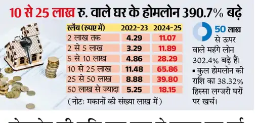 रिपोर्ट बताती है कि देश में 50 लाख रु. से महंगे घरों की बिक्री दो साल में तीन गुना से ज्यादा बढ़ चुकी है। 2022-23 में जहां इतनी कीमत के मकानों के कुल 5.25 लाख होमलोन हुए थे, जो 2024-25 में बढ़कर 18.37 लाख हो गए हैं। यदि कुल घरों की बिक्री देखें तो इनमें लग्जरी घरों की हिस्सेदारी 10.37% रही है। इसका मतलब है कि देश में बिकने वाला हर दसवां घर लग्जरी है। रिपोर्ट के मुताबिक घरों की बिक्री तेजी से बढ़ने की तीन बड़ी वजह हैं। कोविड के बाद अचानक निकली मांग, लोगों की आय में बढ़ोतरी और सरकारी आवास योजना। इन दो साल में 5 लाख से 25 लाख रु. की कीमत वाले 94.15 लाख घर बिके हैं, जबकि 2022-23 में इनकी संख्या 16.34 लाख ही थी।
